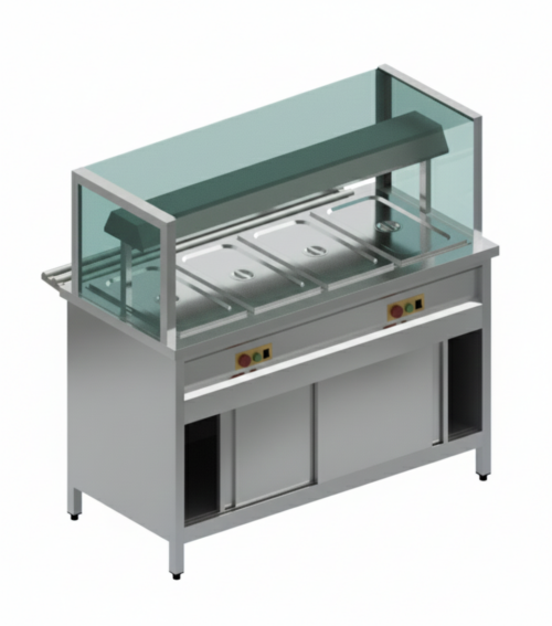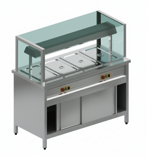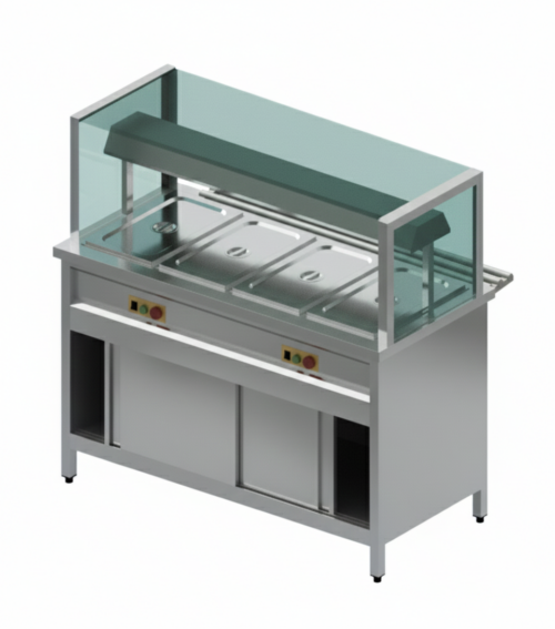 STAINLESS STEEL BAIN MARIE CABINET TYPE WITH GLASS SNEEZE GUARD&SERVING STAND (1 TO 6 GN OF 1/1)