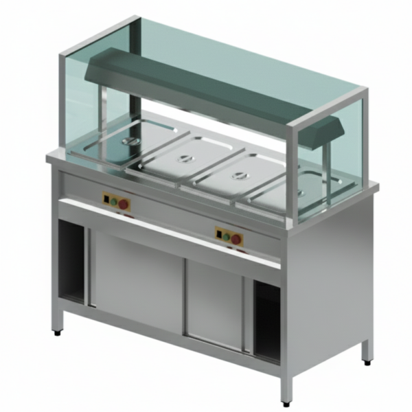STAINLESS STEEL BAIN MARIE TABLE WITH CABINET TYPE WITH GLASS SNEEZE GUARD (1 TO 6 GN OF 1/1)